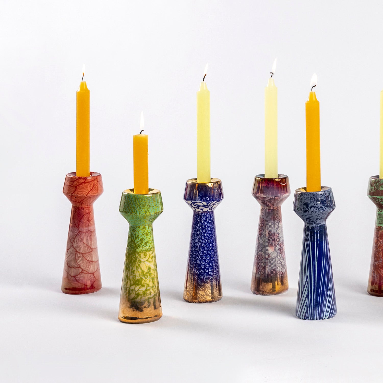 These candleholders are perfect for creating a cozy atmosphere during the season. I use them year-round, but they feel especially fitting at this time of year. Each candleholder is one of a kind, but you might find a matching pair. The rich decoration adds texture to the surface. Designed to hold crown candles.