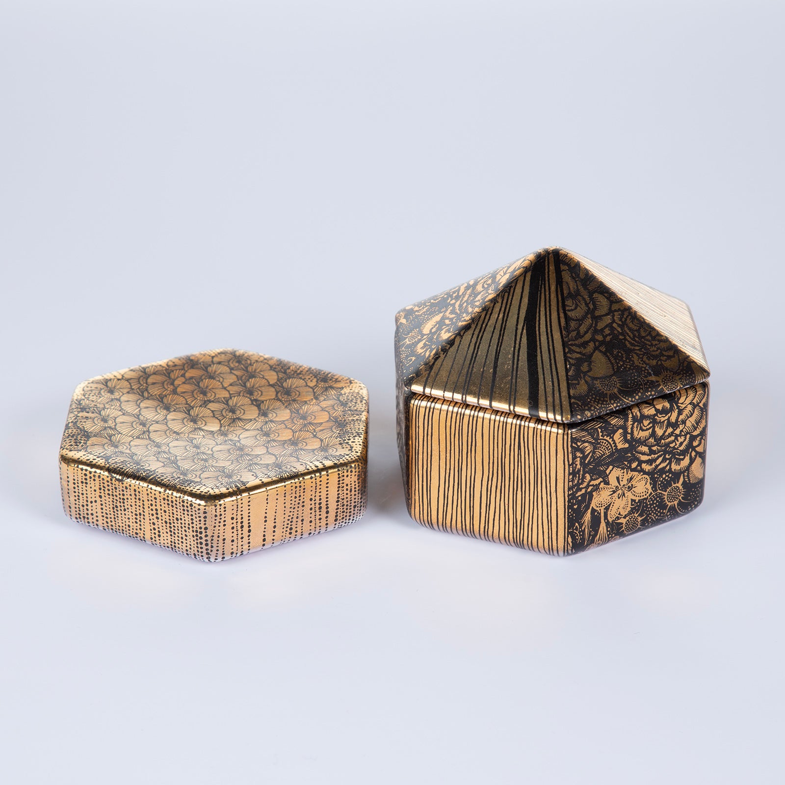 Material: High-fired white stoneware with gold.; dishes are inverted containers.