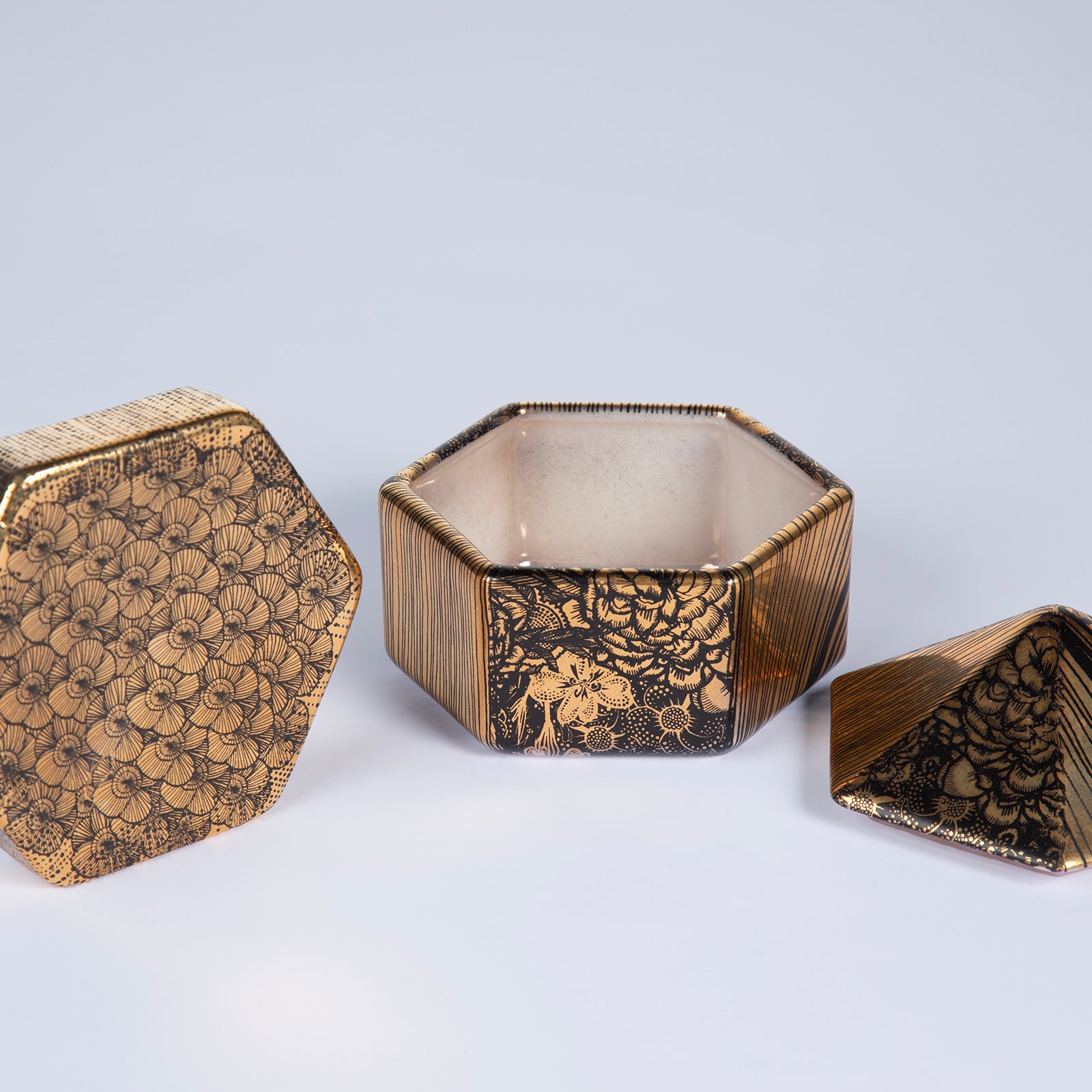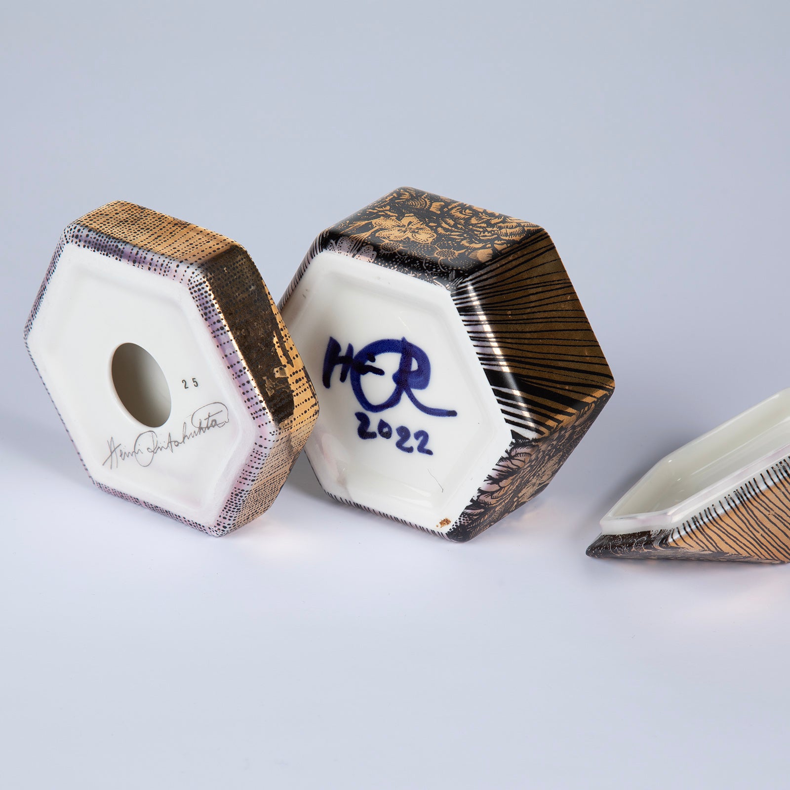 Decoration: Hand-printed and hand-cut serigraphy/monotype, with colored glaze. Finished with real gold detailing.