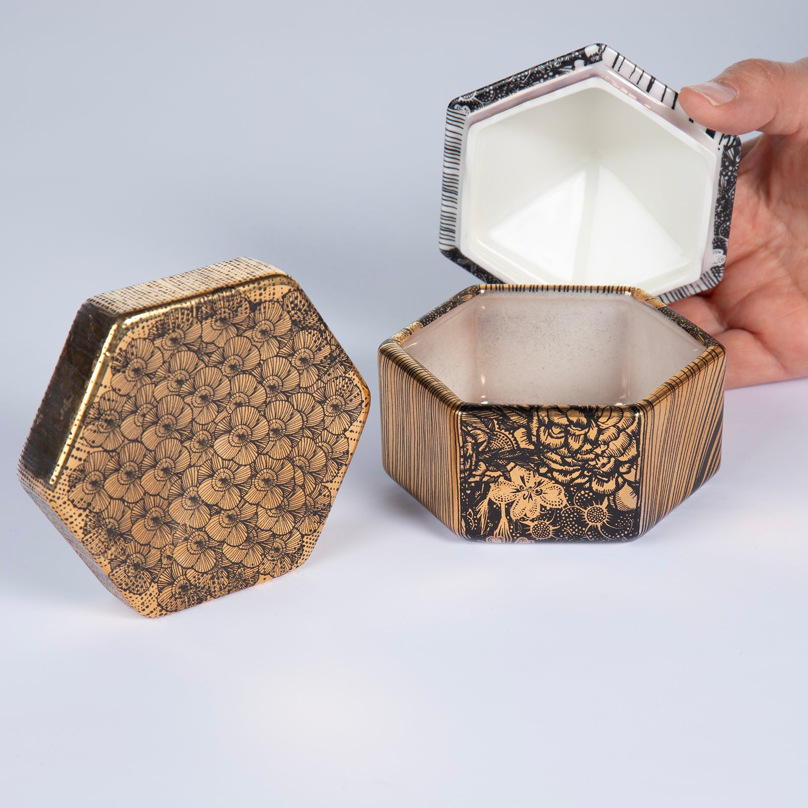 Material: High-fired white stoneware with gold. The jar consists of two parts: a lid and a container.